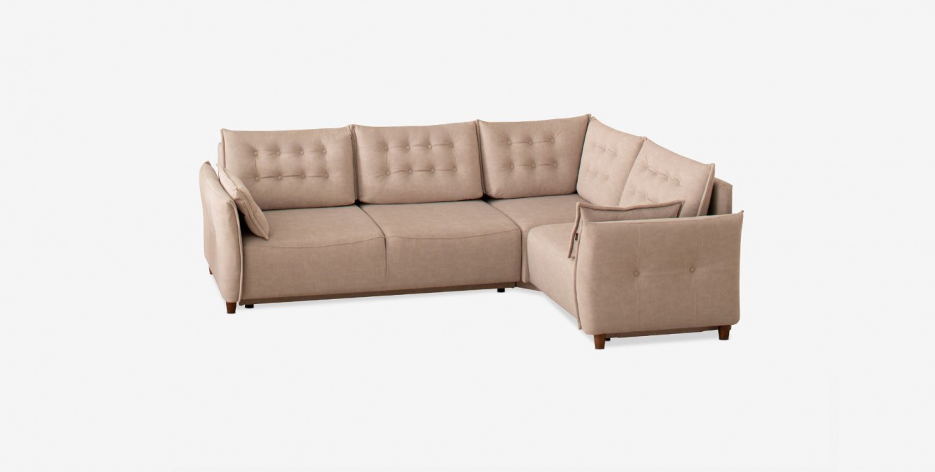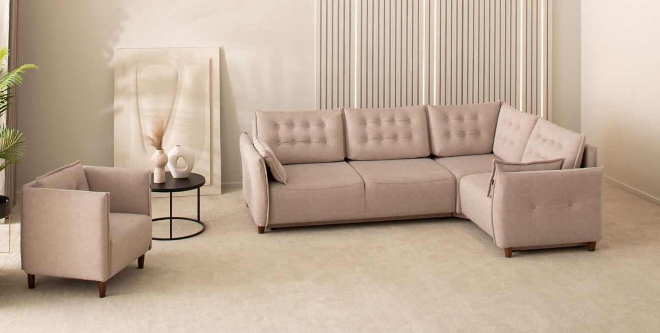 RUBIN minkštas kampas – lengvo dizaino baldas, tinkantis ir modernaus, ir klasikinio stiliaus interjere. Savito subtilumo jam suteikia pagalvėlėse ir porankiuose esančios sagutės.