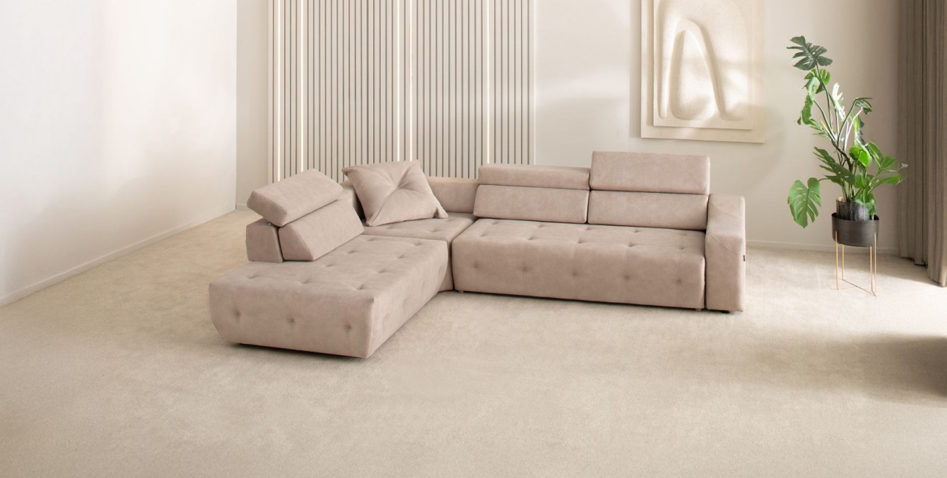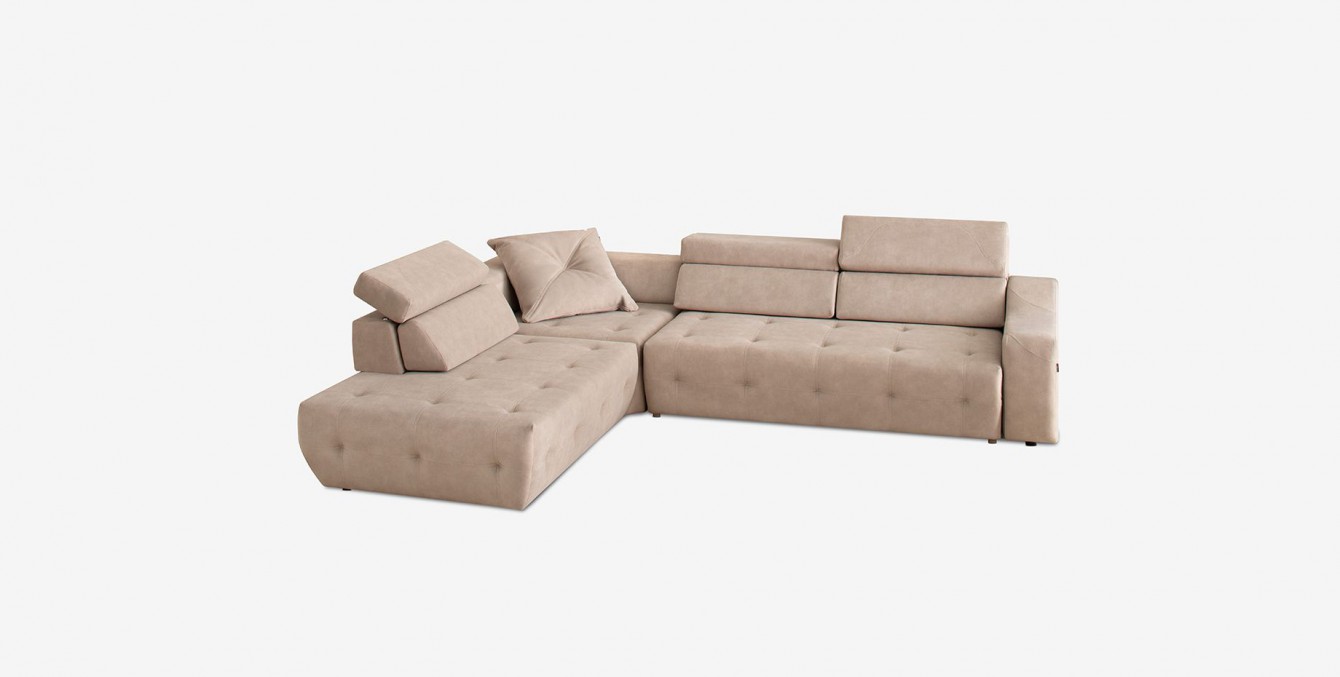Elegant soft corner sofa IMPULSE LEGO. With sleeping mechanism, bed linen box and adjustable headrests for everyday comfort.