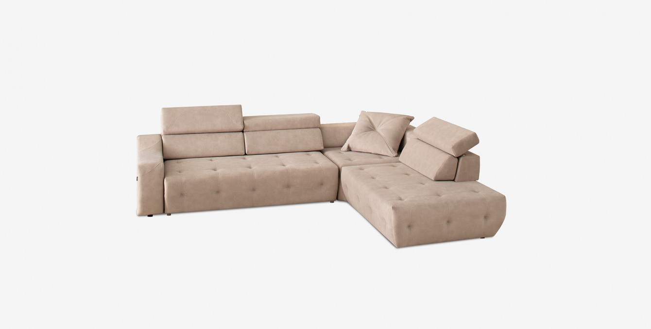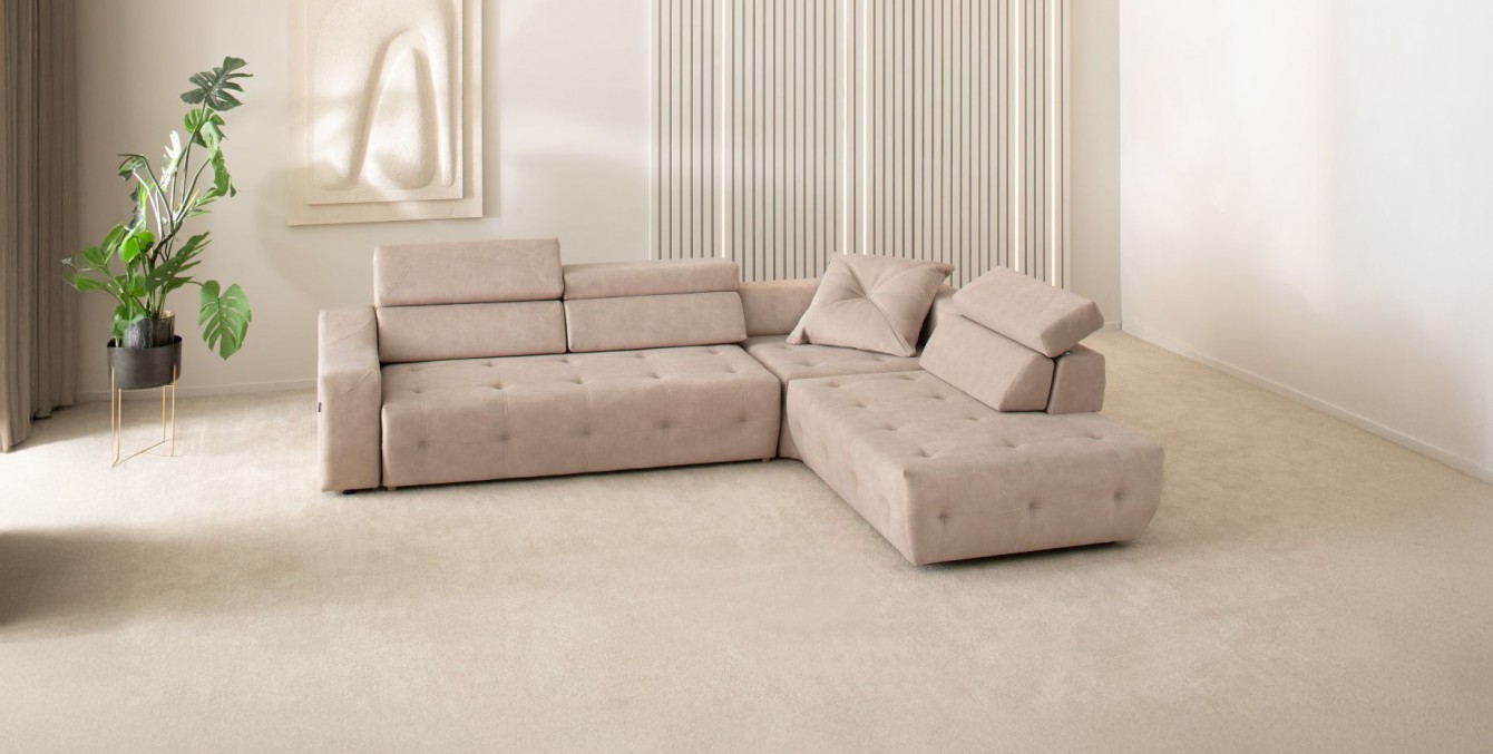 Elegant soft corner sofa IMPULSE LEGO. With sleeping mechanism, bed linen box and adjustable headrests for everyday comfort.