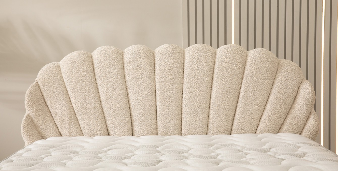 The bed PERLA radiates gentle elegance and organic beauty of form, enhanced by a shell-inspired headboard. Soft textured upholstery and rounded silhouettes create an atmosphere of calm and coziness, inviting relaxation. It is an interior centerpiece that combines comfort, aesthetics, and a subtle sense of luxury.