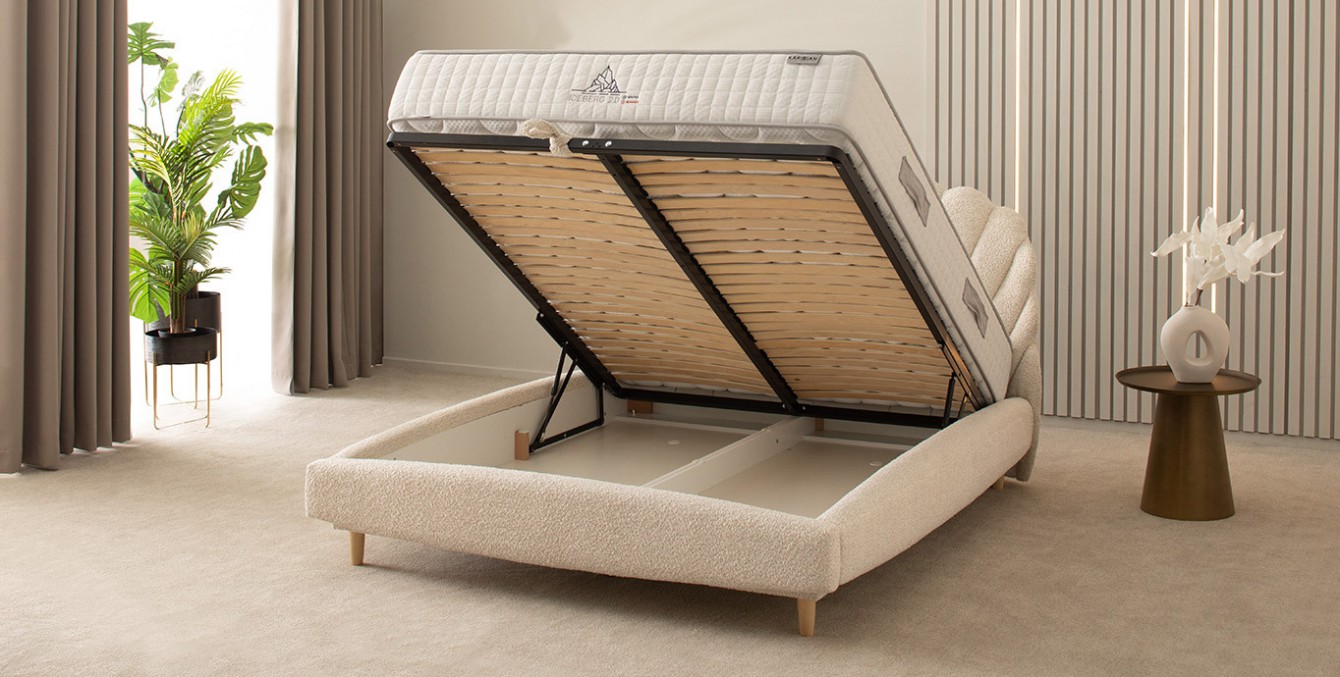 There is a storage space underneath the mattress. Which opens from the back of the bed by lifting the mattress. When the storage space has fully opened the hinge fixates the position, for safe and convenient use. The storage box has ventilation holes to prevent condensation and to ensure ventilation.