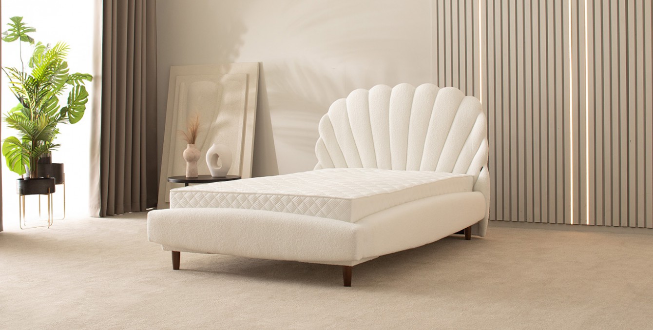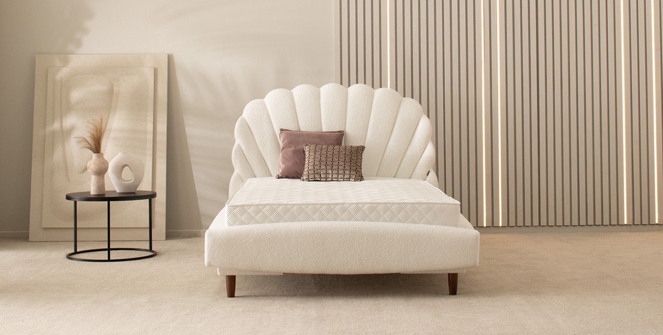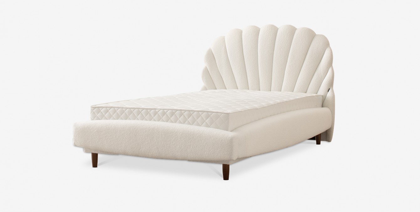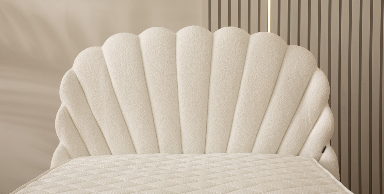 The bed PERLA radiates gentle elegance and organic beauty of form, enhanced by a shell-inspired headboard. Soft textured upholstery and rounded silhouettes create an atmosphere of calm and coziness, inviting relaxation. It is an interior centerpiece that combines comfort, aesthetics, and a subtle sense of luxury.