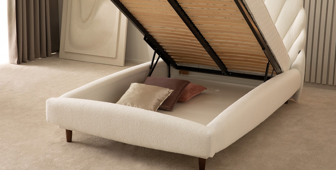 There is a storage space underneath the mattress. Which opens from the back of the bed by lifting the mattress. When the storage space has fully opened the hinge fixates the position, for safe and convenient use. The storage box has ventilation holes to prevent condensation and to ensure ventilation.