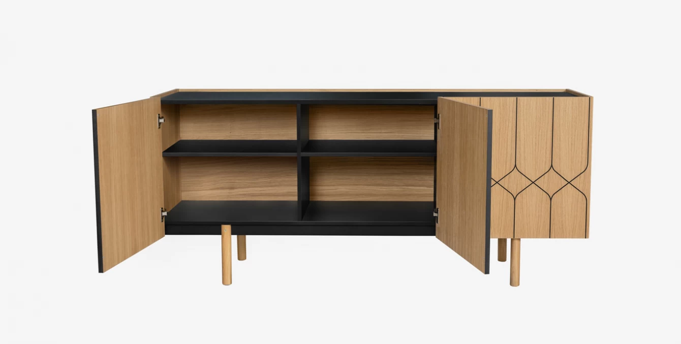 Ši komoda atrodo išties išskirtinai dėl savo juodo stalviršio bei elegantiškų, juodų, dekoratyvių raštų ant durelių.